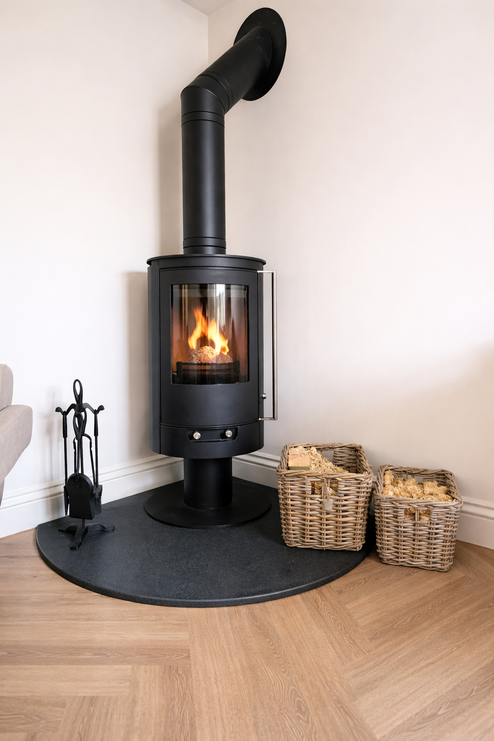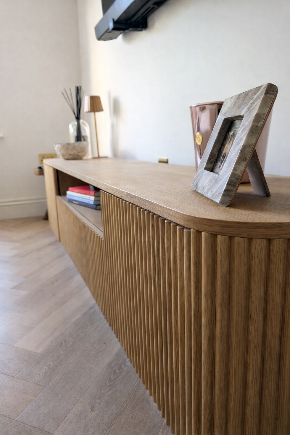 A minimalist lounge designed for a couple seeking a serene space to relax, watch films, and enjoy the warmth of a cozy fire, all enhanced by calming neutral tones that promote relaxation. This project exemplifies our commitment to transforming spaces into inviting, tranquil retreats tailored to our clients’ lifestyles.